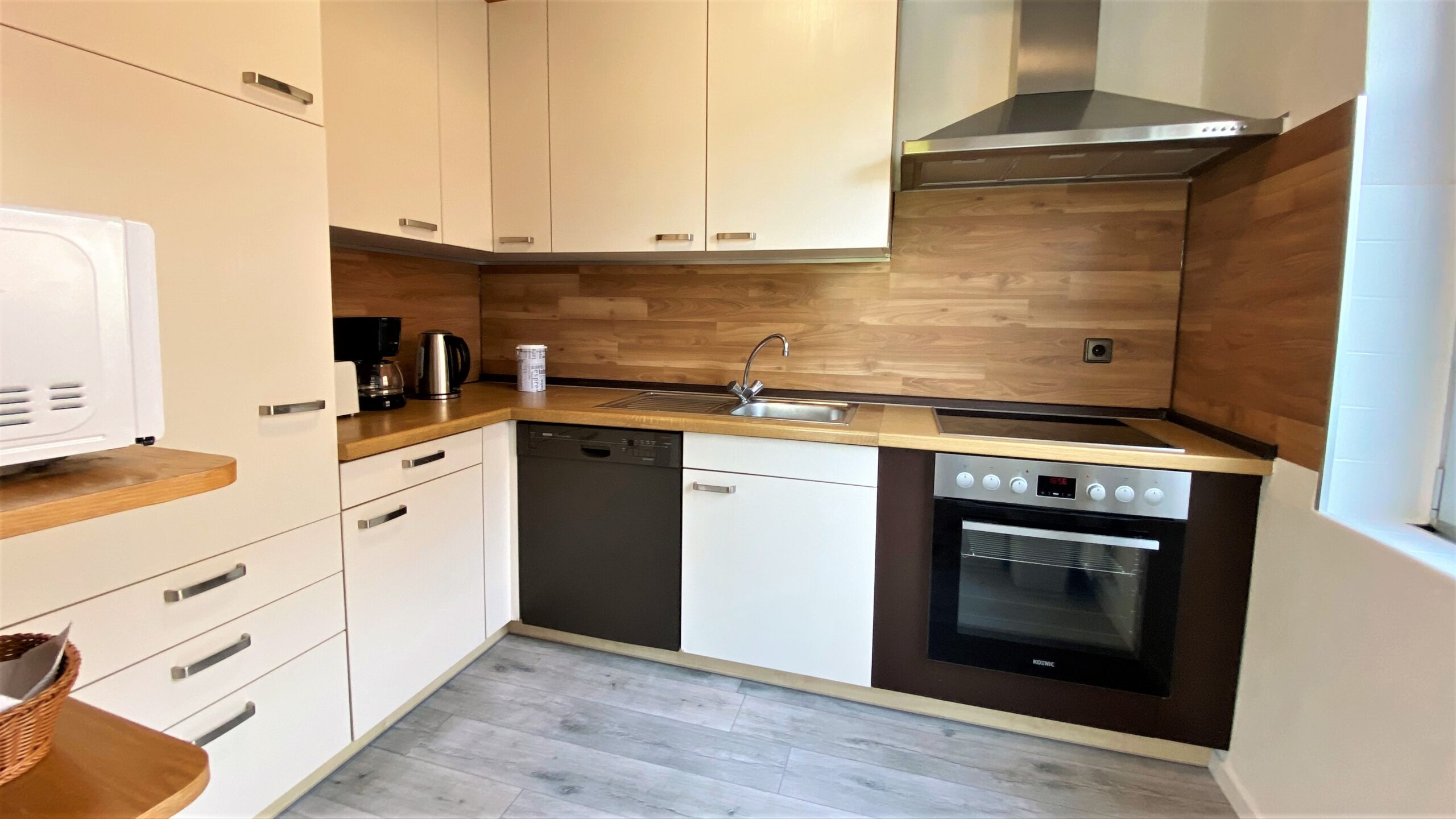 Кухня полностью оборудована холодильником/морозильником, электрической плитой с керамической варочной поверхностью и духовкой, посудомоечной машиной, чайником, кофеваркой, микроволновой печью и тостером.